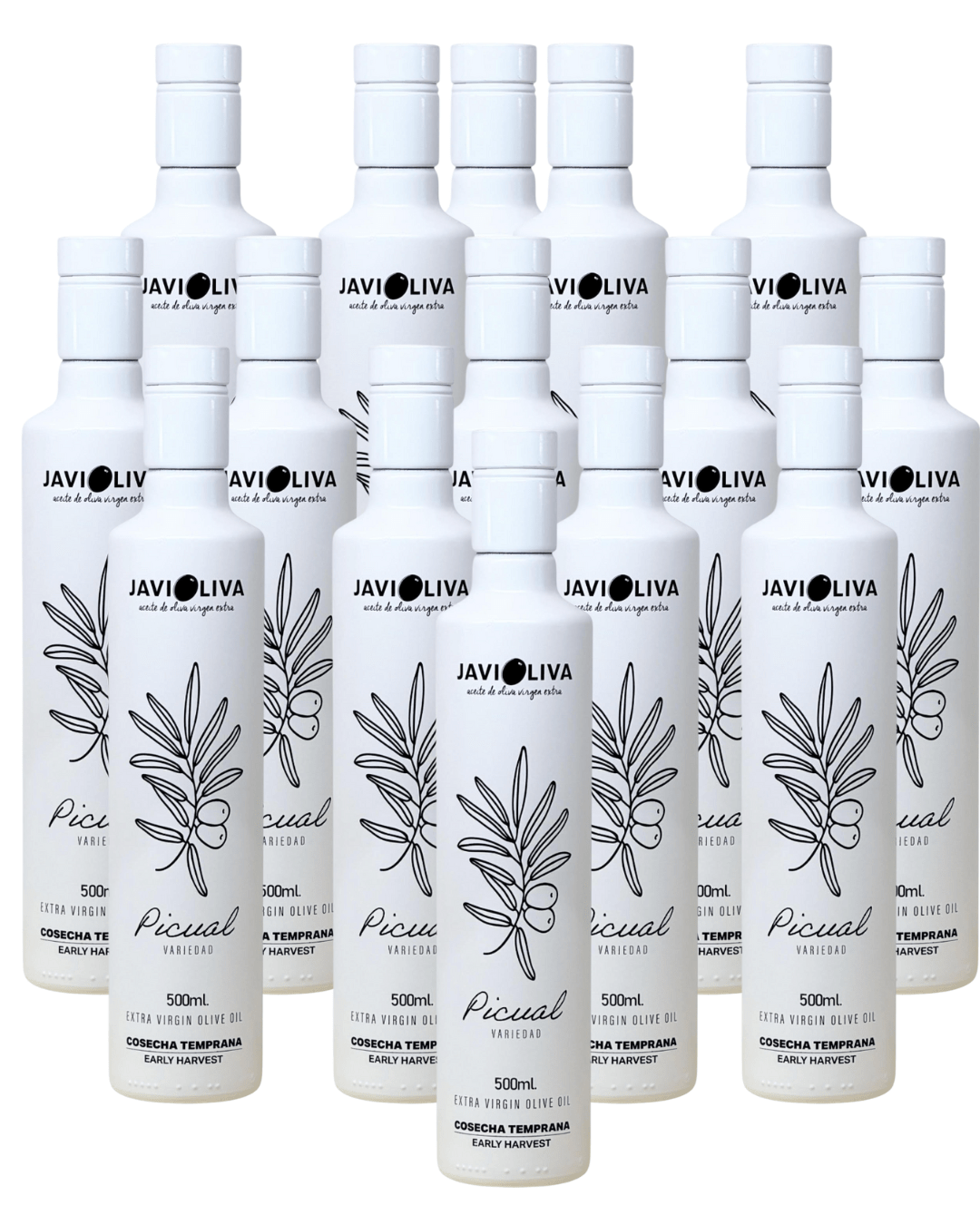 Botella de aceite de oliva virgen extra variedad Picual COSECHA TEMPRANA 2025-26 Premium – caja de Quince unidades